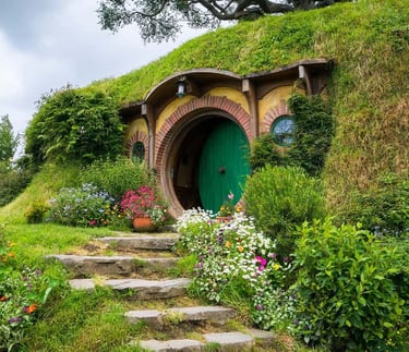 Hobbit-Inspired Homes: Cozy, round-door homes covered in grass and flowers, designed to blend seamlessly with the natural landscape.